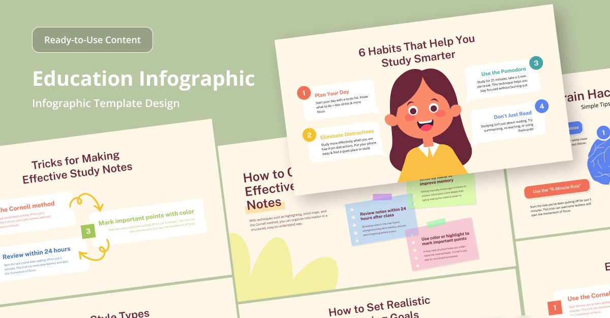 A vibrant infographic template designed for young learners and online educators. Includes illustration-driven tips to improve time management, learning habits, and academic results. **Highlights:** – 6 Infographic Design Variations – Fully Layered and Editable – Fully Customizable (text, color, & objects are editable) – Free Fonts Used – RGB, 72dpi …