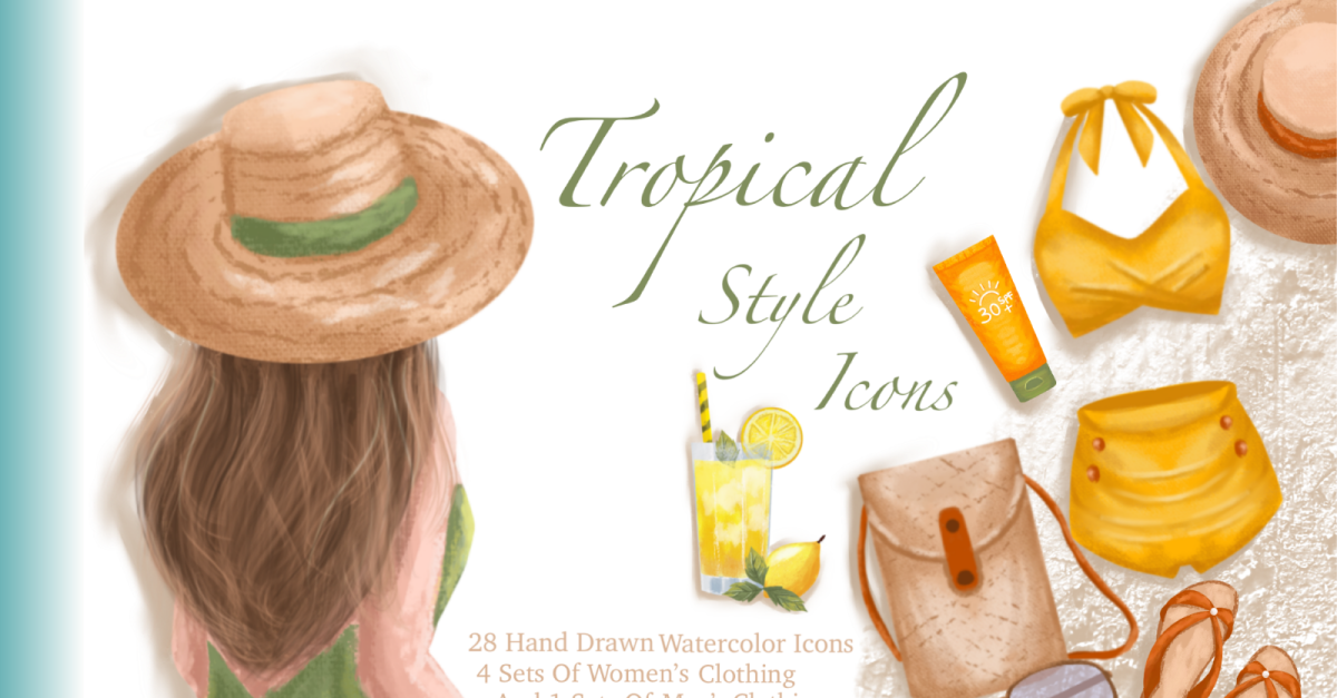 Watercolor Tropical Clothing Icons – Summer Fashion & Beachwear Clipart Set This beautiful Watercolor Tropical Clothing Icon Set features hand-painted illustrations of summer fashion, beachwear, and tropical lifestyle essentials. Including items like swimwear, sunglasses, hats, beach bags, and refreshing drinks, these elements are perfect for seasonal branding, digital planners, scrapbooking, …
