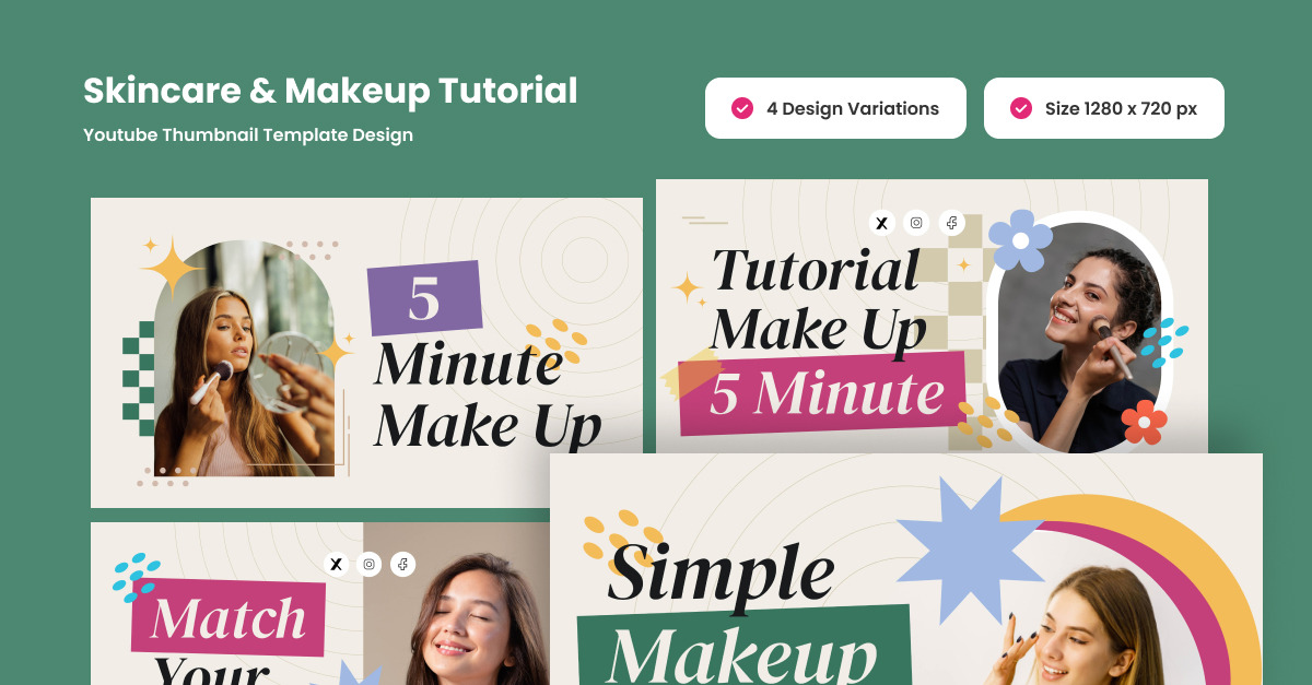 Showcase your glam makeup look with this feminine, soft-modern thumbnail. Uses strong composition, elegant color palette, and clear product placement to create a professional beauty brand impression. **Highlights:** – Thumbnail Size (1280×720 px) – 4 Design Variations – Fully Layered and Editable – Fully Customizable (text, color, & objects are …