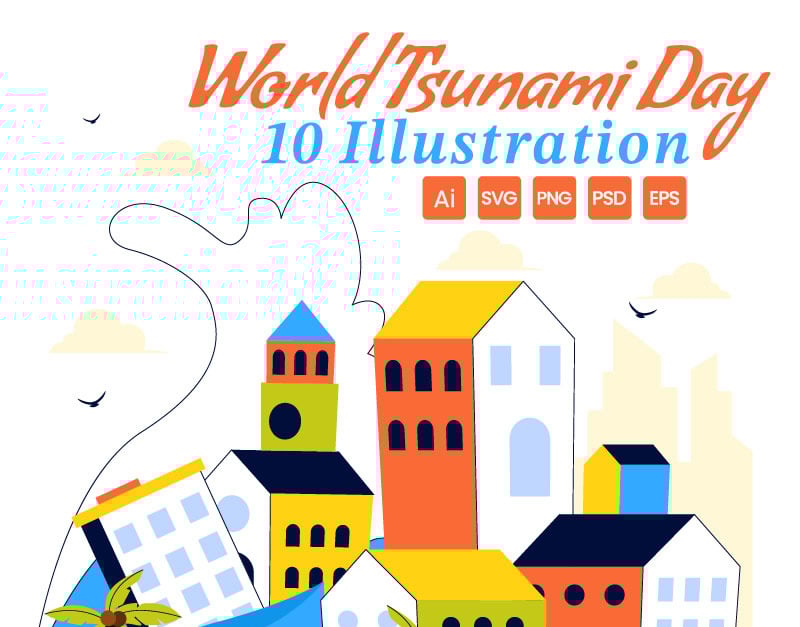 World Tsunami Awareness Day Vector Illustration on November 5, featuring Waves Crashing into Houses, Trees, and Buildings in a Flat Style Background Suitable for Poster, Web Banner, Brochure, Landing Page and Others Background Template Features: – Fully editable vector files, easy to edit the object, color and background – Include …