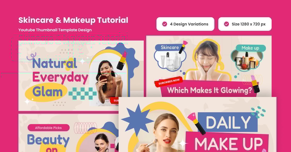 Showcase your glam makeup look with this feminine, soft-modern thumbnail. Uses strong composition, elegant color palette, and clear product placement to create a professional beauty brand impression. **Highlights:** – Thumbnail Size (1280×720 px) – 4 Design Variations – Fully Layered and Editable – Fully Customizable (text, color, & objects are …
