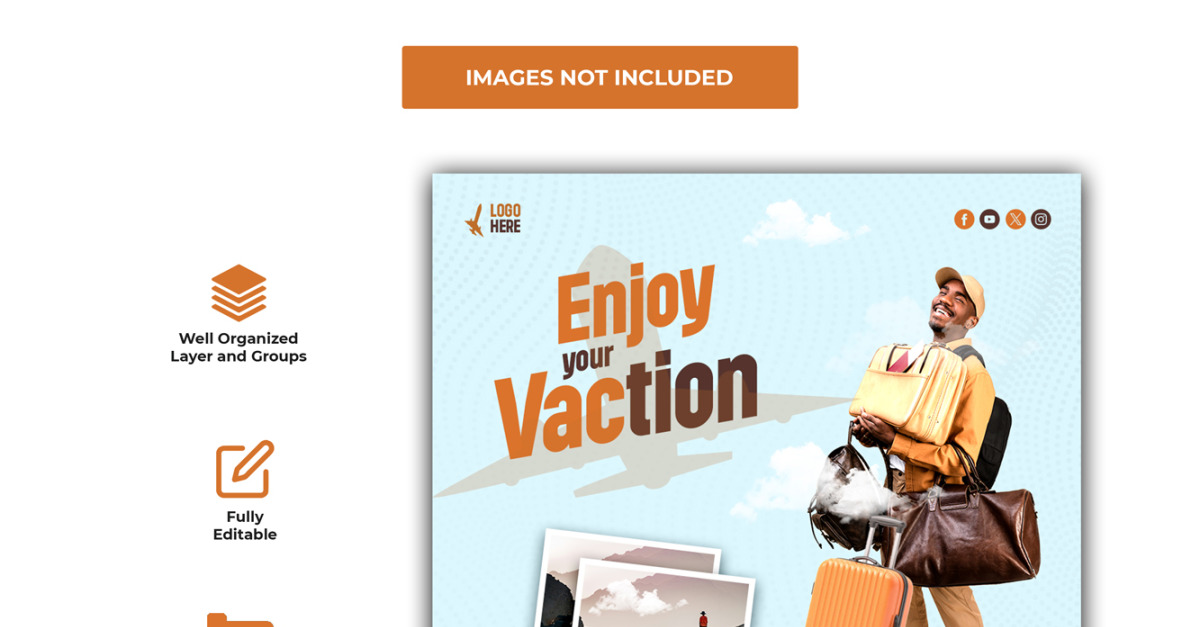 Promote your travel agency with this eye-catching PSD template featuring a cheerful traveler, trendy luggage, and stunning scenic photos. Designed for vacation ads and holiday promotions, it offers fully editable text layers, vibrant visuals, and a clean, modern layout that grabs attention instantly. Perfect for boosting social media engagement, online …