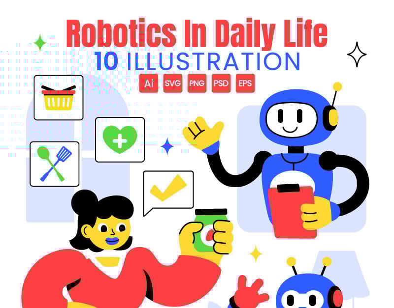 Robotics in Daily Life Vector Illustration featuring Robots and Automated Systems Assisting Human Activities with Remote Control and Automation Suitable for Poster, Web Banner, Brochure, Landing Page and Others Background Template Features: – Fully editable vector files, easy to edit the object, color and background – Include 100% vector Ai, …